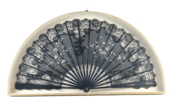 Ventaglio con stecche in legno ebanizzato inciso e dorato. Pagina realizzata in pizzo ad ago nero e una parte in tessuto di seta nero dipinto a motivi floreali. Entro teca sagomata (cm 75x40) (lievi difetti)