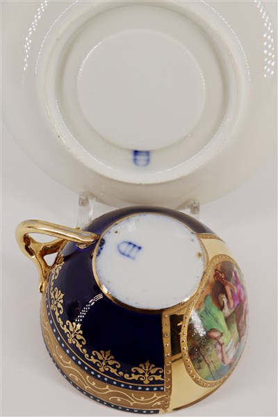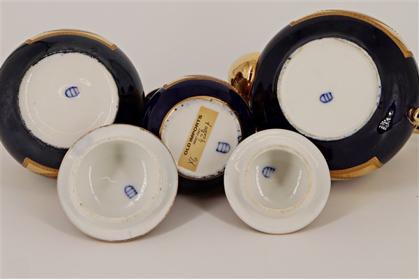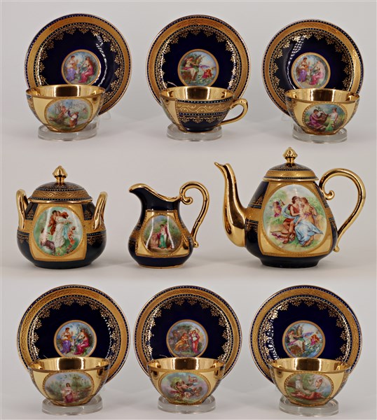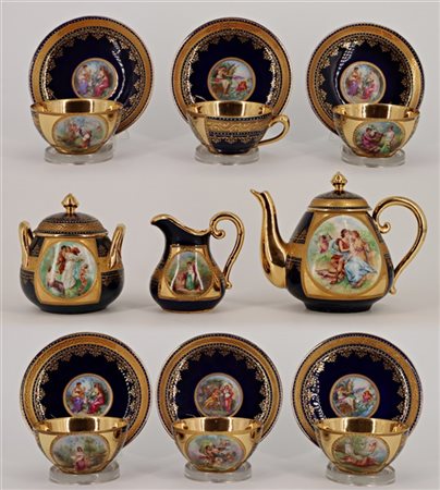 Manifattura di Vienna, secolo XX. Servizio da tè in porcellana decorato in policromia su fondo blu e oro (difetti)