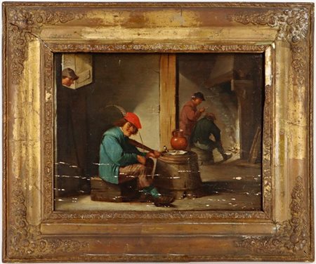 Scuola nordica del secolo XIX "Interno di taverna" olio su tavola (cm 24x33)