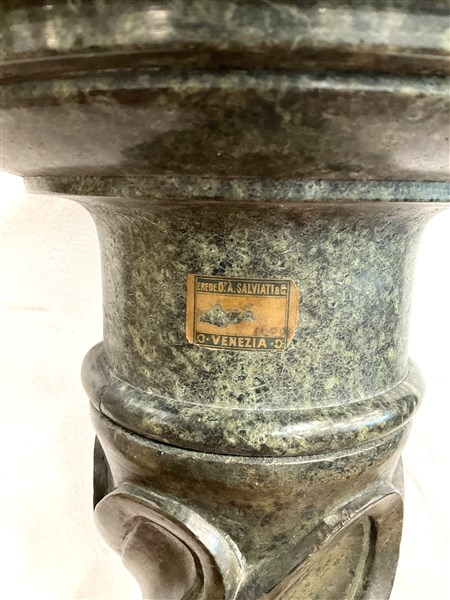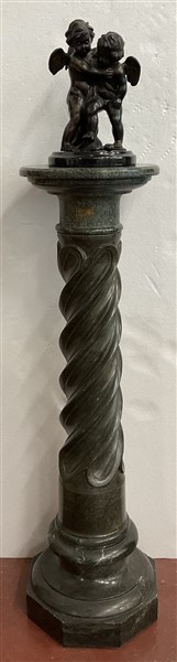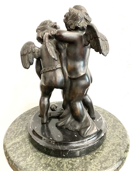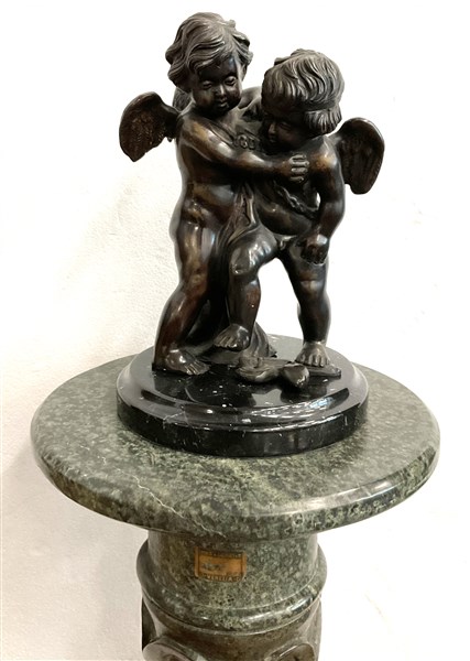 Da Jean-Baptiste Pigalle, scultura in bronzo raffigurante amorini giocosi (h cm 29) su colonna in marmo verde a torciglione (h cm 106) (difetti)