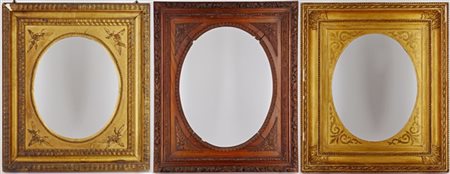 Lotto di tre cornici differenti di cui due dorate, misure differenti. Secolo XIX (difetti)