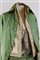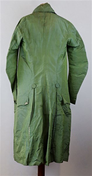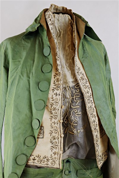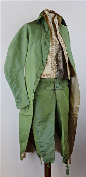 Manifattura francese, inizio secolo XIX. Completo marsina e pantaloni in seta verde cangiante azzurra, un paio di calze in seta tubolari con piccoli ricami ed uno jabot in cotone con volant di pizzo.