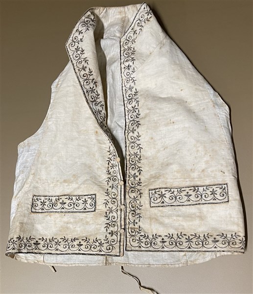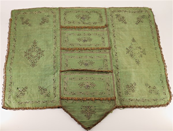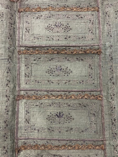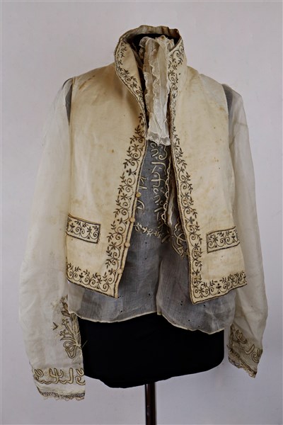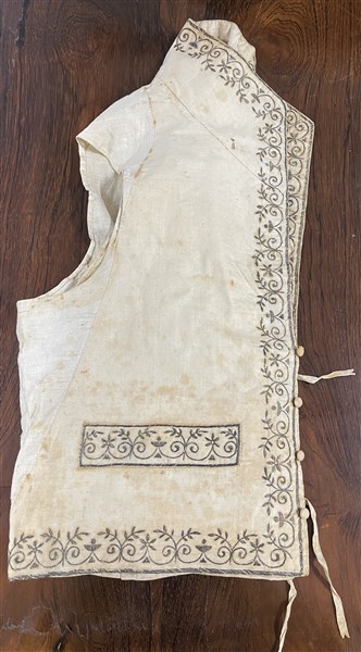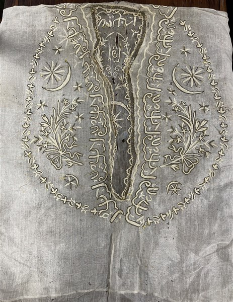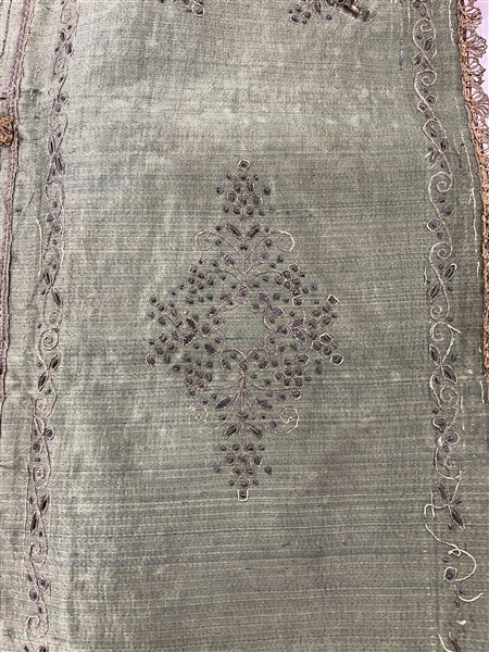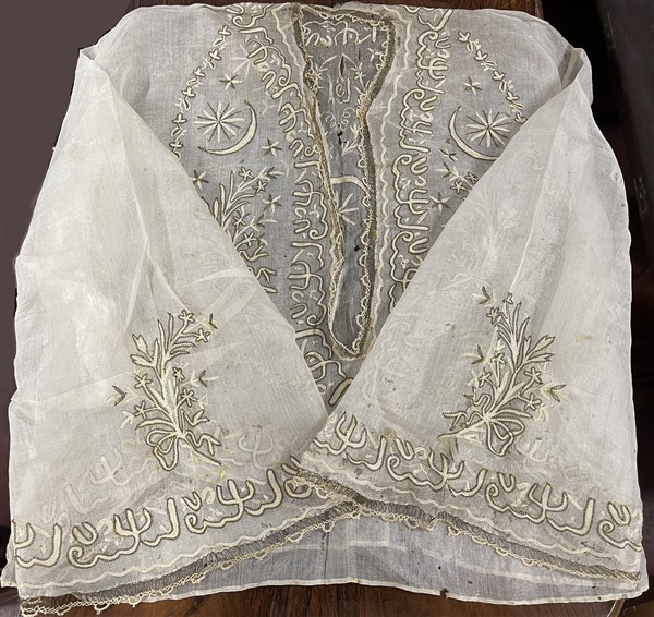 Unito ad una camicia in garza di seta cruda ricamata con motivi ornamentali riconducibili a scritte islamiche, un panciotto in seta bianca con ricami in filo d'argento ed un porta documenti in seta verde con ricami in filo d'argento. Impero Ottomano, secolo XIX (difetti)