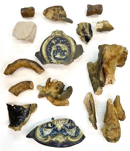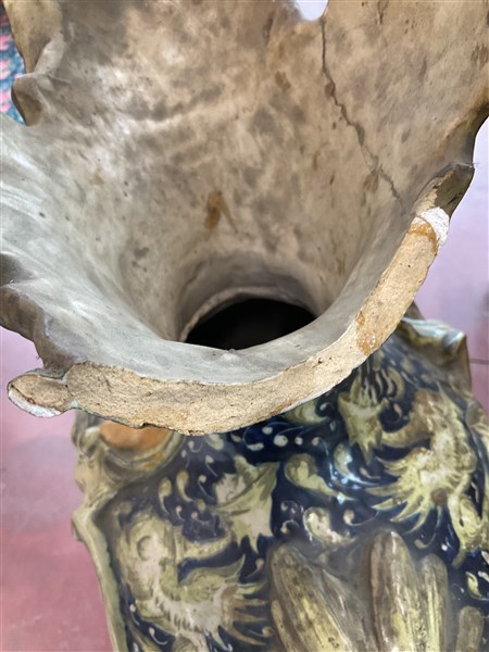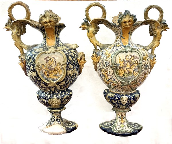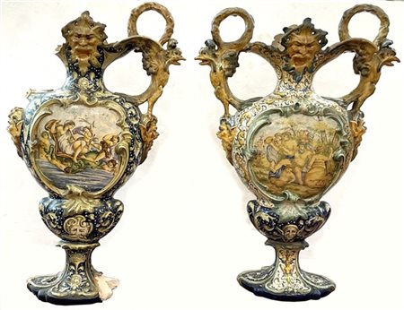 Manifattura dell'Italia Centrale, fine secolo XIX. Due grandi vasi in terracotta dipinta in policromia a grottesche e figure mitologiche entro riserve, orlo con mascheroni ed anse a guisa di animali fantastici (h cm 94) (gravi difetti, mancanze e restauri)