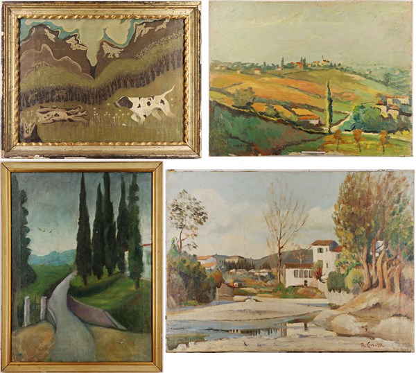 Cartone contenente numerosi oli e tecniche miste su supporti diversi raffiguran