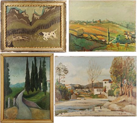 Cartone contenente numerosi oli e tecniche miste su supporti diversi raffiguranti paesaggi, di autore e misure diverse (misura max cm 50x70) alcuni firmati, alcuni in cornice