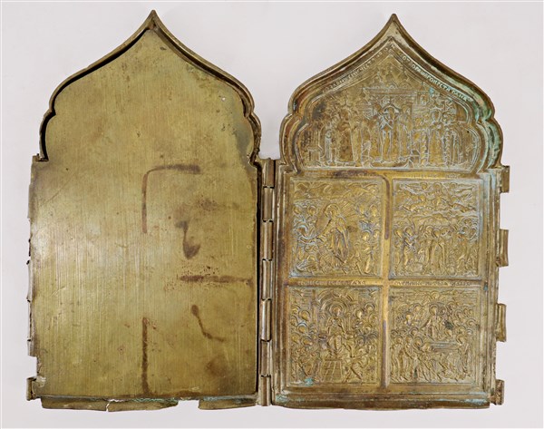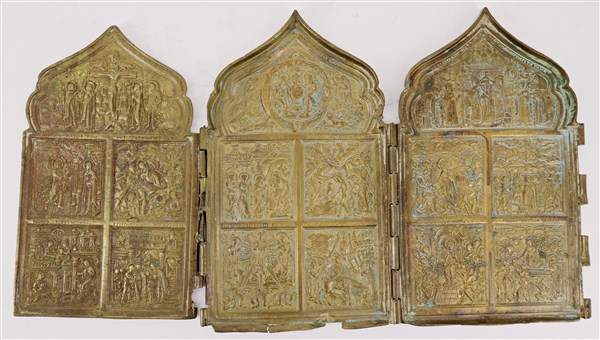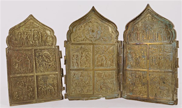 Arte russa del secolo XIX, icona da viaggio a trittico in bronzo raffigurante le Dodici Grandi Feste (aperta cm 17,5x31) (difetti e mancanze)