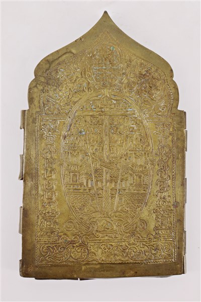 Arte russa del secolo XIX, icona da viaggio a trittico in bronzo raffigurante l