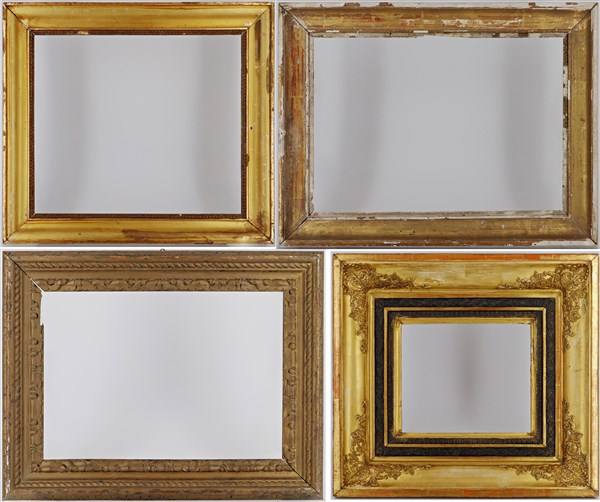 Lotto di quattro cornici in legno dorato, misure differenti. Secolo XIX (difett