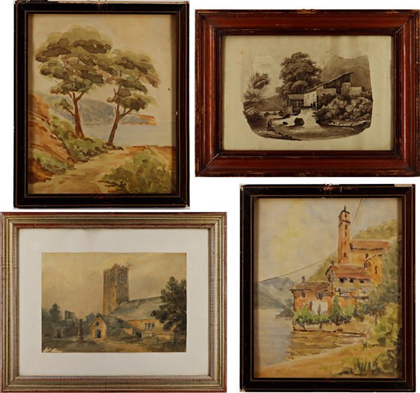 Lotto composto da tre acquerelli e una china su carta raffiguranti Paesaggi, di diversi autori e misure