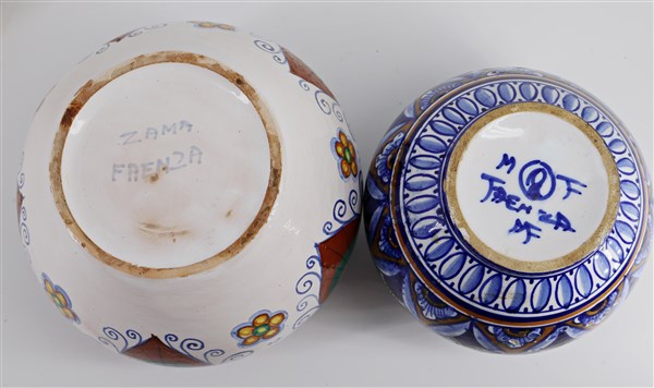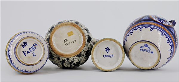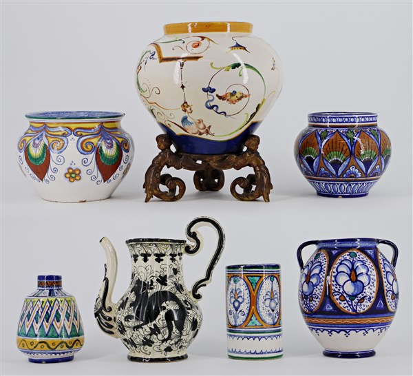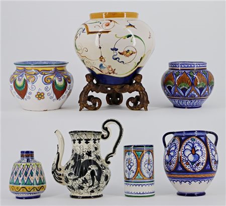 Manifatture di Faenza, secoli XIX-XX. Lotto composto da sette diversi oggetti i