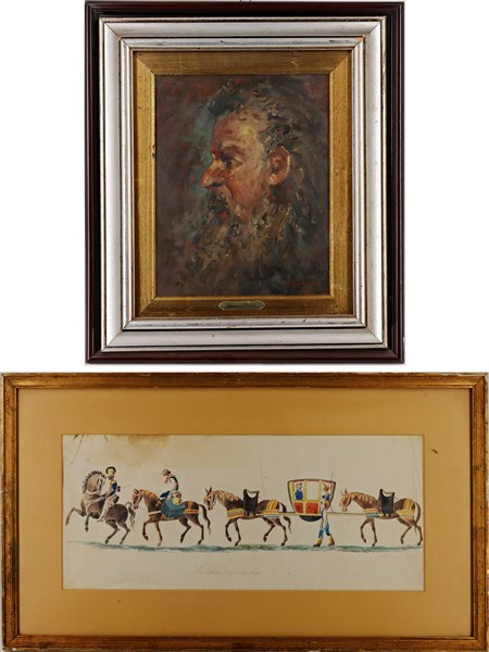 Lotto composto da un ritratto virile ad olio su compensato e un acquerello su carta raffigurante un corteo, di diversi autori e misure