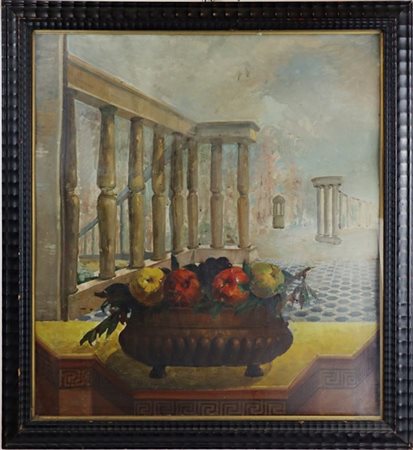 "Composizione con canestra di frutta e colonnati sullo sfondo"