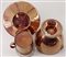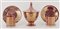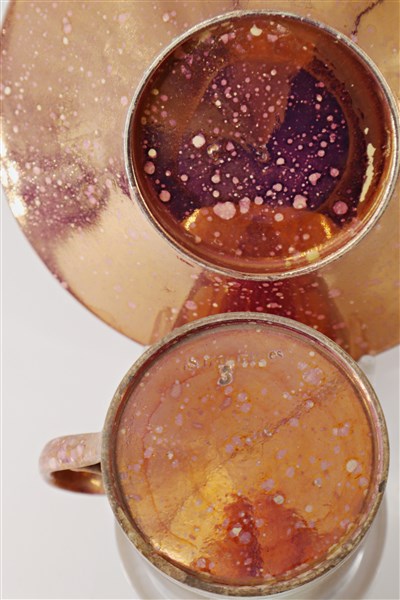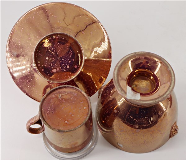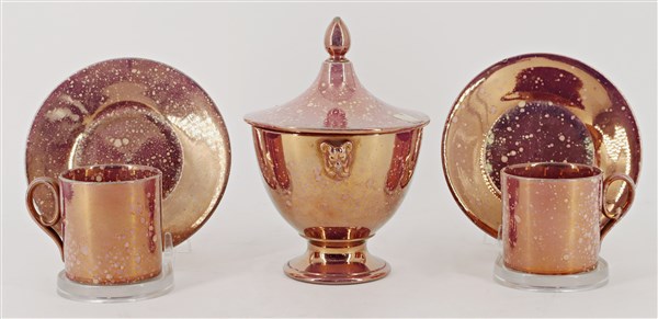 Manifattura Sarreguemines, secolo XIX. Parte di servizio da caffè in porcellana decorata a lustro composta da dieci tazze con nove piattini e una zuccherira con coperchio, marcato (difetti)
