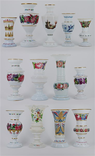 Manifatture dei secoli XIX-XX. Lotto di tredici diversi vasi in vetro opalino decorati a fiori e paesaggi con profili in oro (h max cm 26) (difetti)