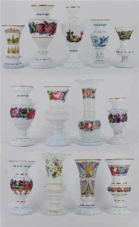 Manifatture dei secoli XIX-XX. Lotto di tredici diversi vasi in vetro opalino d