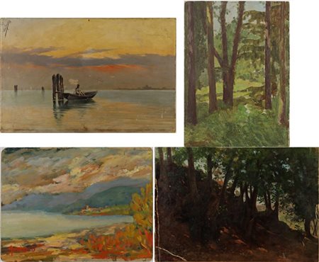 Lotto composto da quattro "Paesaggi" ad olio su diversi ssupporti, di diverse misure
