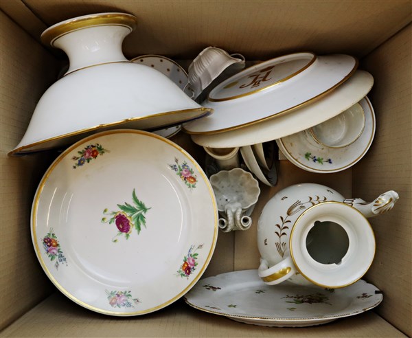 Manifatture differenti, secolo XIX-XX. Lotto di numerosi oggetti per la tavola principalmente in porcellana, entro cartone (difetti e mancanze)