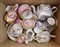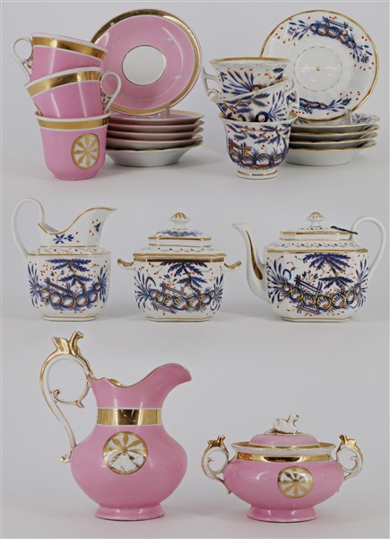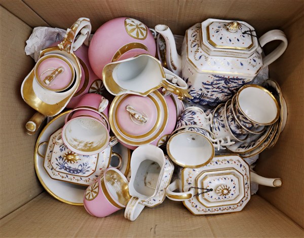 Manifatture del secolo XIX-XX, parti di servizi da tè di fatture differenti, in cartone (difetti)