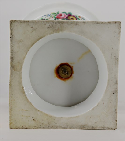 Manifattura del secolo XIX, vaso in porcellana dipinto in policromia e oro con elementi naturalistici, anse con mascheroni e base quadrata (h cm 33) (difetti)