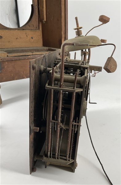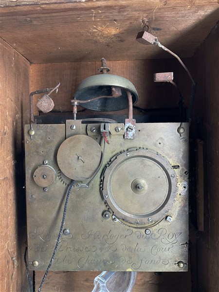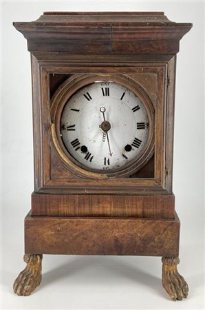 Robert Horloger du Roi. Orologio con cassa in legno di forma parallelpipeda, quadrante in smalto bianco a numeri romani per le ore e arabi per i minuti. Movimento a due treni con suoneria delle ore e quarti. Svizzera, fine secolo XVIII (cm 32x49x20) (gravi difetti e mancanze) Iscritto al retro
