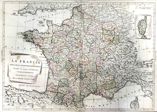 [FRANCIA - MAPPA]. Mappa antica Francia (620 x 820mm). Misure della cornice. Venezia: Zatta, 1793. Colorata a mano (difetti)
