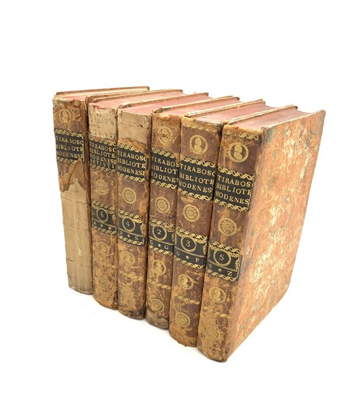 TIRABOSCHI, Girolamo. Biblioteca modenese o notizie della vita e delle opere degli scrittori natii degli stati del serenissimo signor Duca di Modena. Modena: Società tipografica, 1781. 6 volumi, il sesto volume comprensivo di due parti, 4to (245x175mm). Marca tipografica al frontespizio, testatine e iniziali xilografiche (bruniture, fioriture). Legatura coeva con dorso in pelle su carta marmorizzata, tagli rossi (difetti alle cerniere, alcune mancanze ai dorsi). Non collazionato, difetti da esaminare e non passibile di storno. [6]