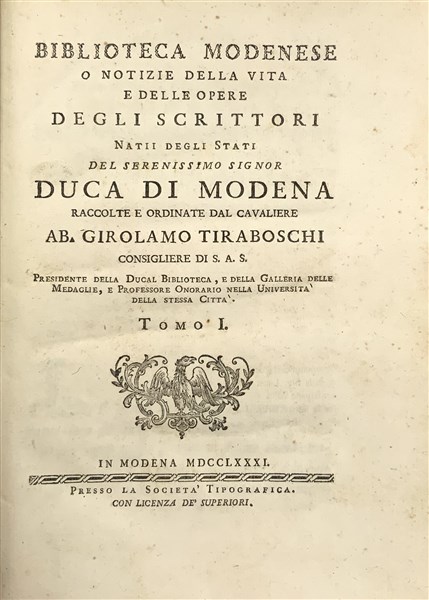 TIRABOSCHI, Girolamo. Biblioteca modenese o notizie della vita e delle opere de