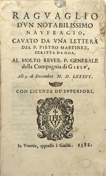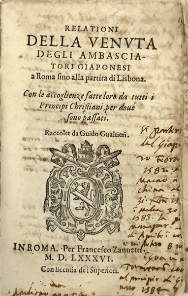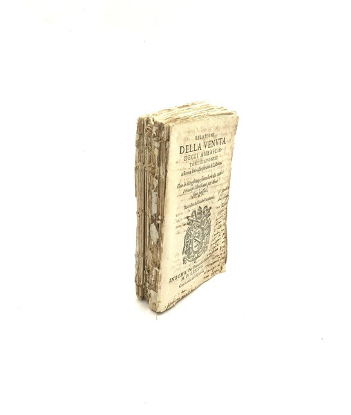 [VIAGGI - GIAPPONE] - Lotto di interessanti opere cinquecentesche inerenti il Giappone, sottolineate e annotate: Lettera annale del Giappone scritta al padre generale della Compagnia di Giesù. Brescia: Sabbio, 1590. 8vo (160x98mm). Stemma dei gesuiti al frontespizio, iniziali xilografiche (bruniture, tracce di umidità e strappetti marginali che sfiorano il testo). - Relationi della venuta degli ambasciatori giapponesi a Roma fino alla partita di Lisbona. Roma: Zannetti, 1586. 8vo (155x105mm). Armi di Sisto V al frontespizio, fregi e iniziali xilografiche (bruniture, tracce di polvere, gore d'acqua marginali). - Raguaglio d'un notabilissimo naufragio, cavato da una lettera del P. Pietro Martinez scritta da Goa. Venezia: Giolitti, 1588. 8vo (162x100mm). Stemma dei Gesuiti al frontespizio, testatine e iniziali xilografiche (bruniture, gore d'acqua, alcuni strappetti marginali). Le opere si presentano prive di legatura e con alcune carte distaccate. Non collazionato, difetti da esaminare e non passibile di storno. [3]