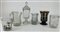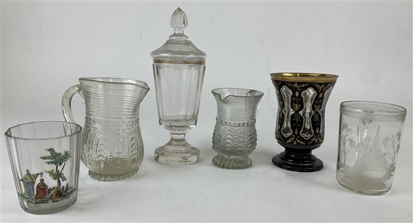 Manifatture di epoche differenti. Lotto composto da una tazza incisa a scena classica, un bicchiere decorato a freddo a scena religiosa e quattro oggetti diversi in vetro (difetti)
