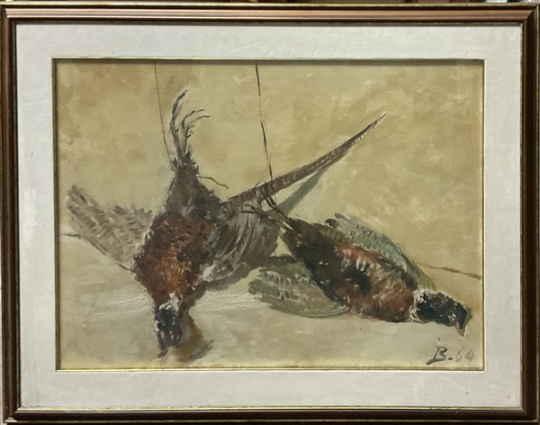 Ignoto "Cacciagione con fagiani" 1964, olio su tela (cm 70x93) siglato B. e datato in basso a destra