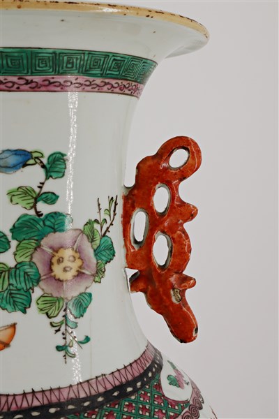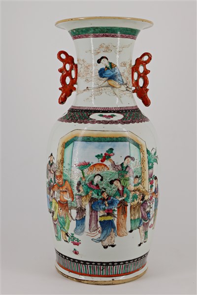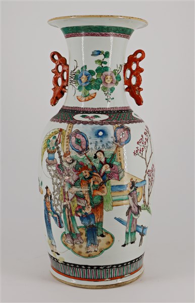 Vaso in porcellana policroma Famiglia Rosa decorato con scene di corte. Cina, secolo XIX-XX (h cm 44,5) (difetti)
