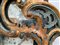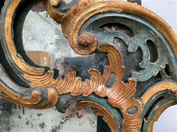 Antica caminiera in legno intagliato, dorato e laccato con cimasa centrata da specchi e decorata a volute fogliate (cm 195x140 ca.) (difetti)