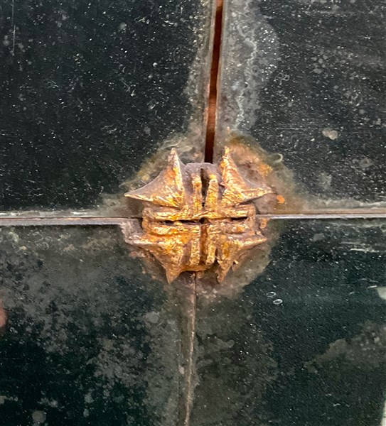Antica caminiera in legno intagliato, dorato e laccato con cimasa centrata da s