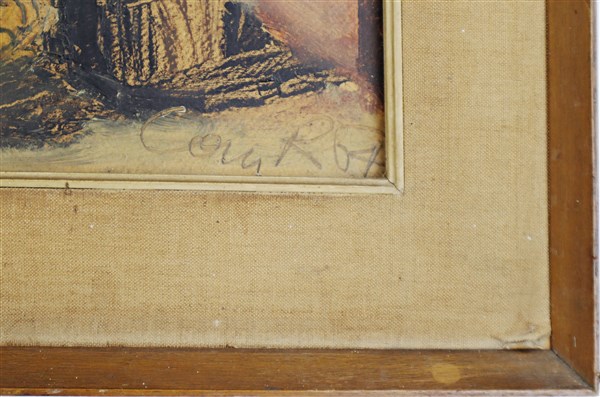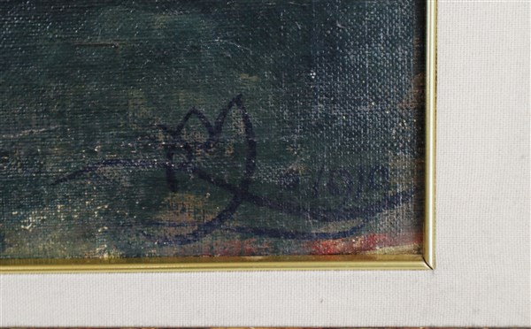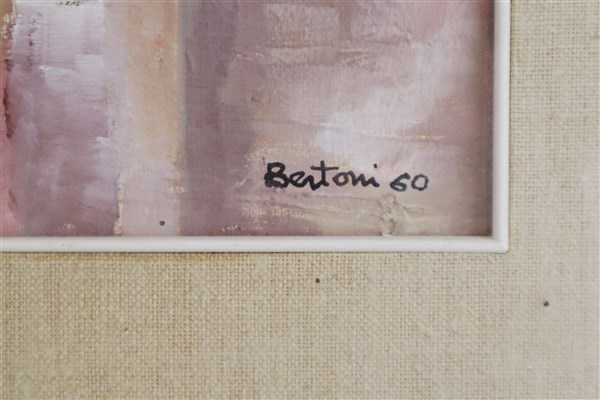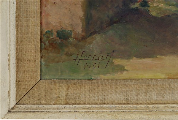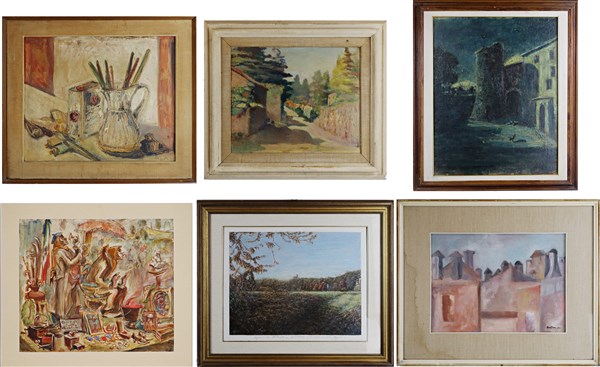 Lotto composto da due oli su tela, due su compensato e due su carta raffiguranti paesaggi, scene d'interno e nature morte, di autore e misure diversi (misura max cm 50x58), tutti firmati