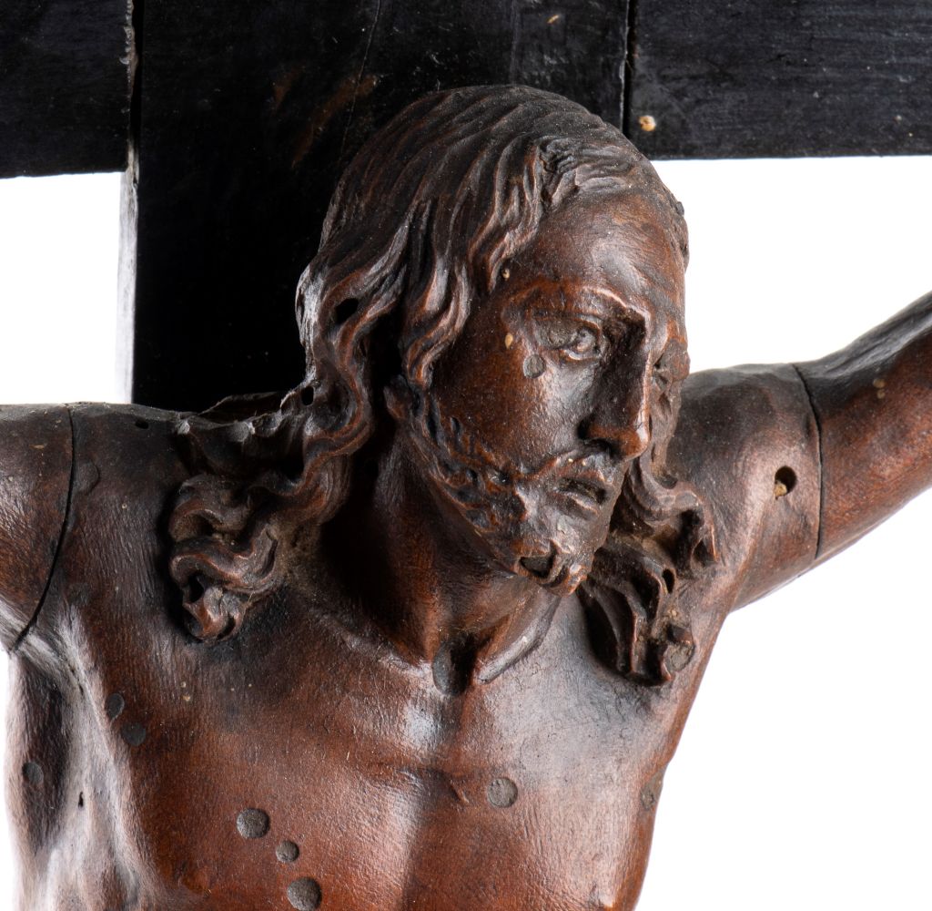 Corpus Christi in legno di bosso scolpito, posto su una croce lignea con basamento il legno ebanizzato.