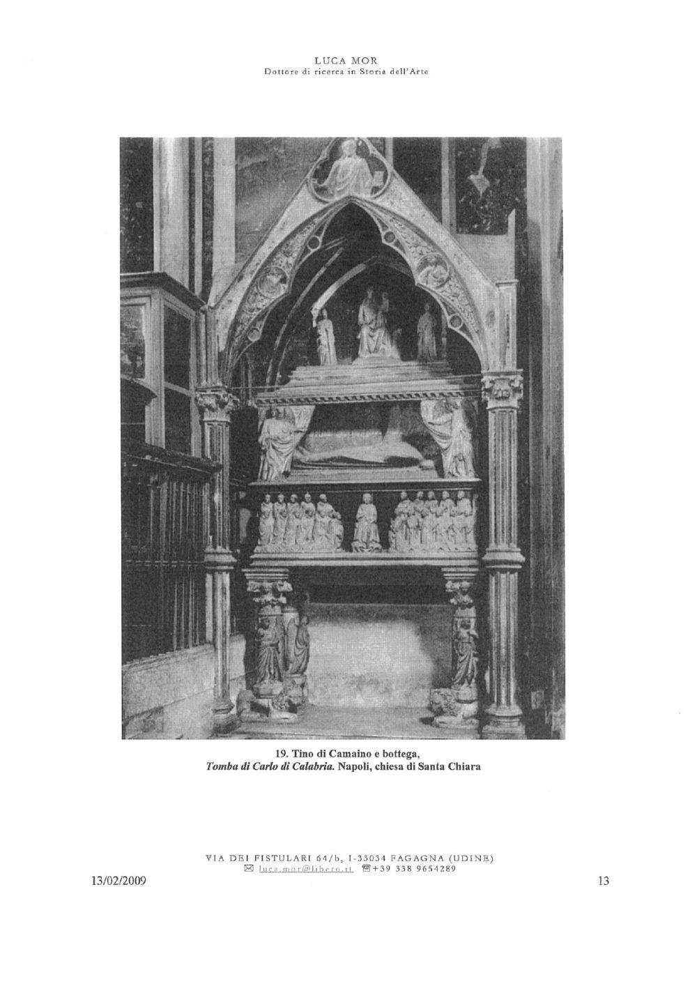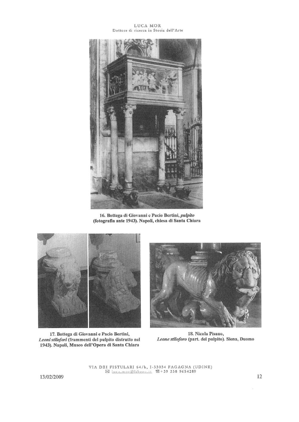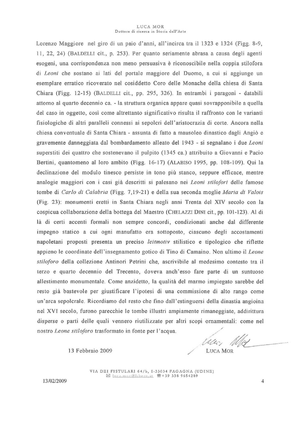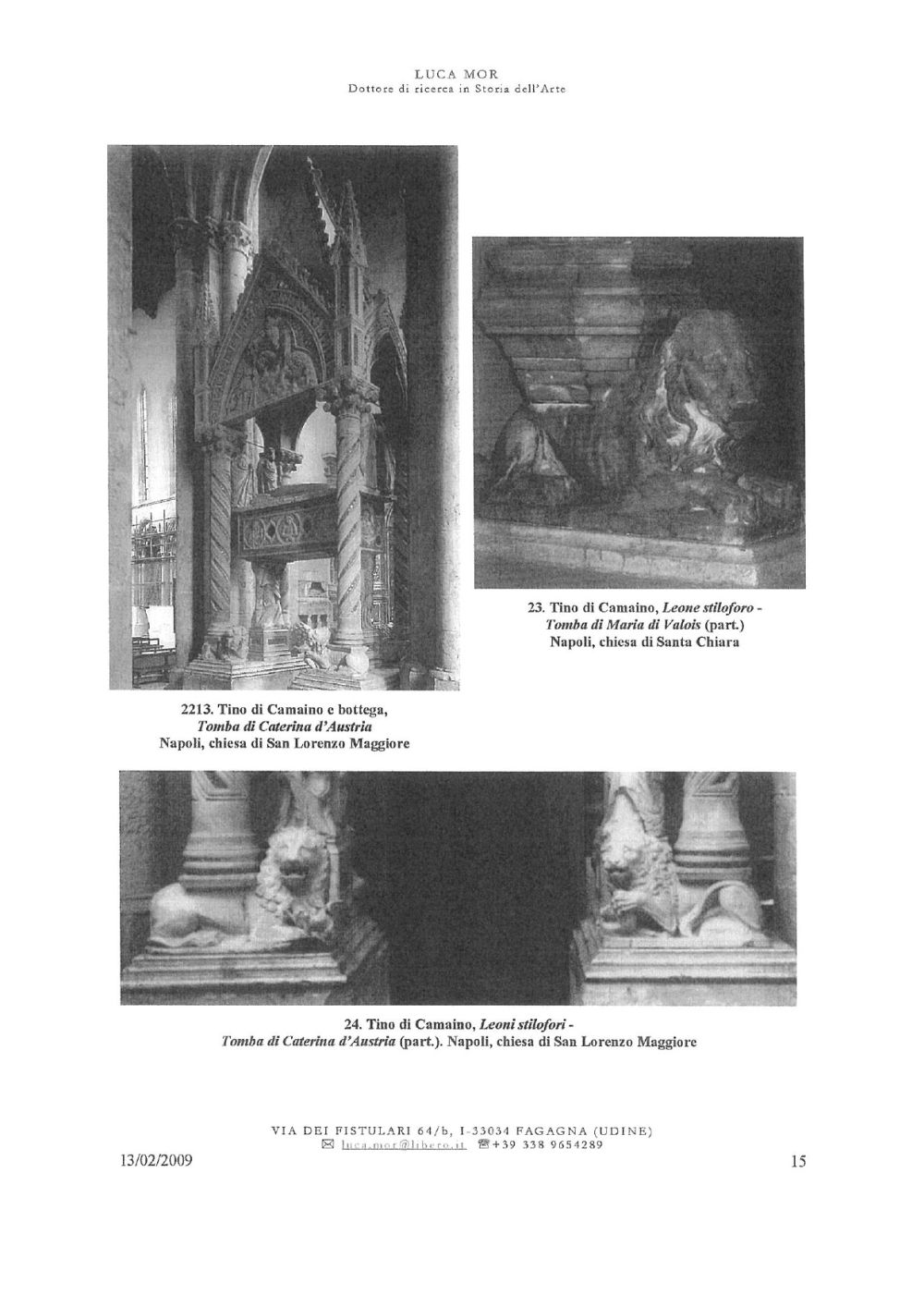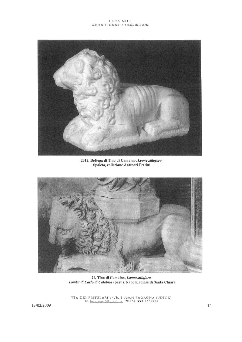 E' possibile comparare il leone con altri della Napoli angioina, quali: i leoni che ornano la tomba di Caterina d'Austria (prima moglie di Carlo di Calabria) a San Lorenzo Maggiore; i leoni ai lati del portale maggiore del Duomo; nella chiesa conventuale di Santa Chiara, dove sopravvivo due leoni di quattro che sostenevano il pulpito; i leoni presenti nelle tombe di Carlo di Calabria e della sua seconda moglie Maria di Valois eretti bella chiesa di Santa Chiara.