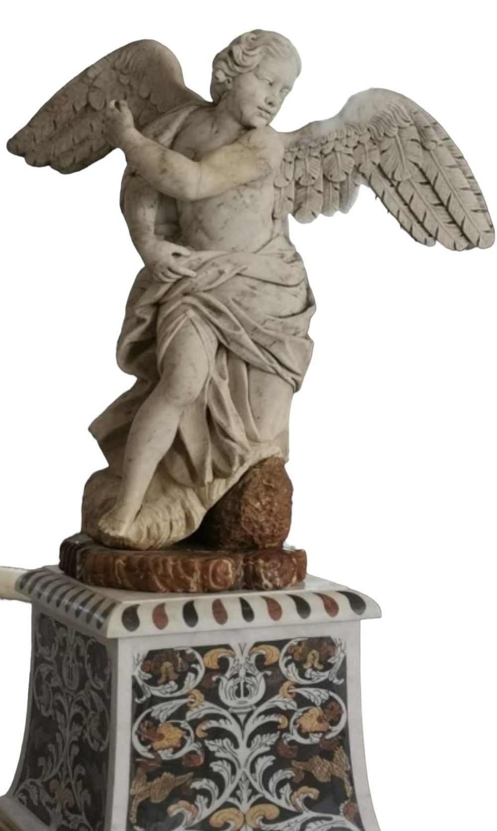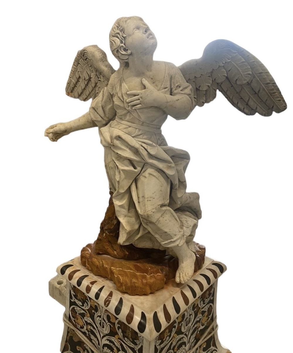 Rara coppia di Putti alati in marmo Sicilia, XVII secolo Altezza basi: 79 cm, altezza putti: 120 cm circa.