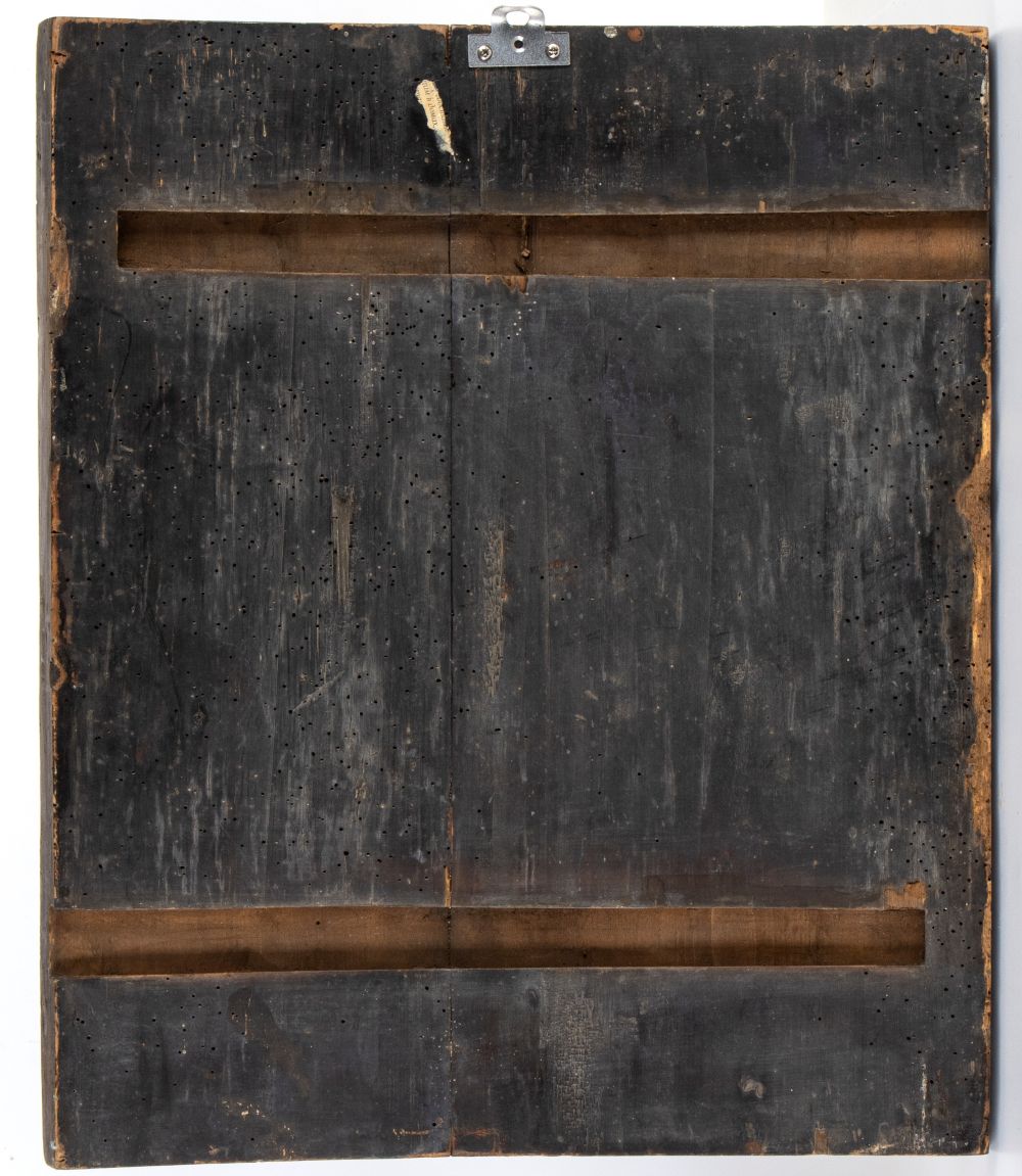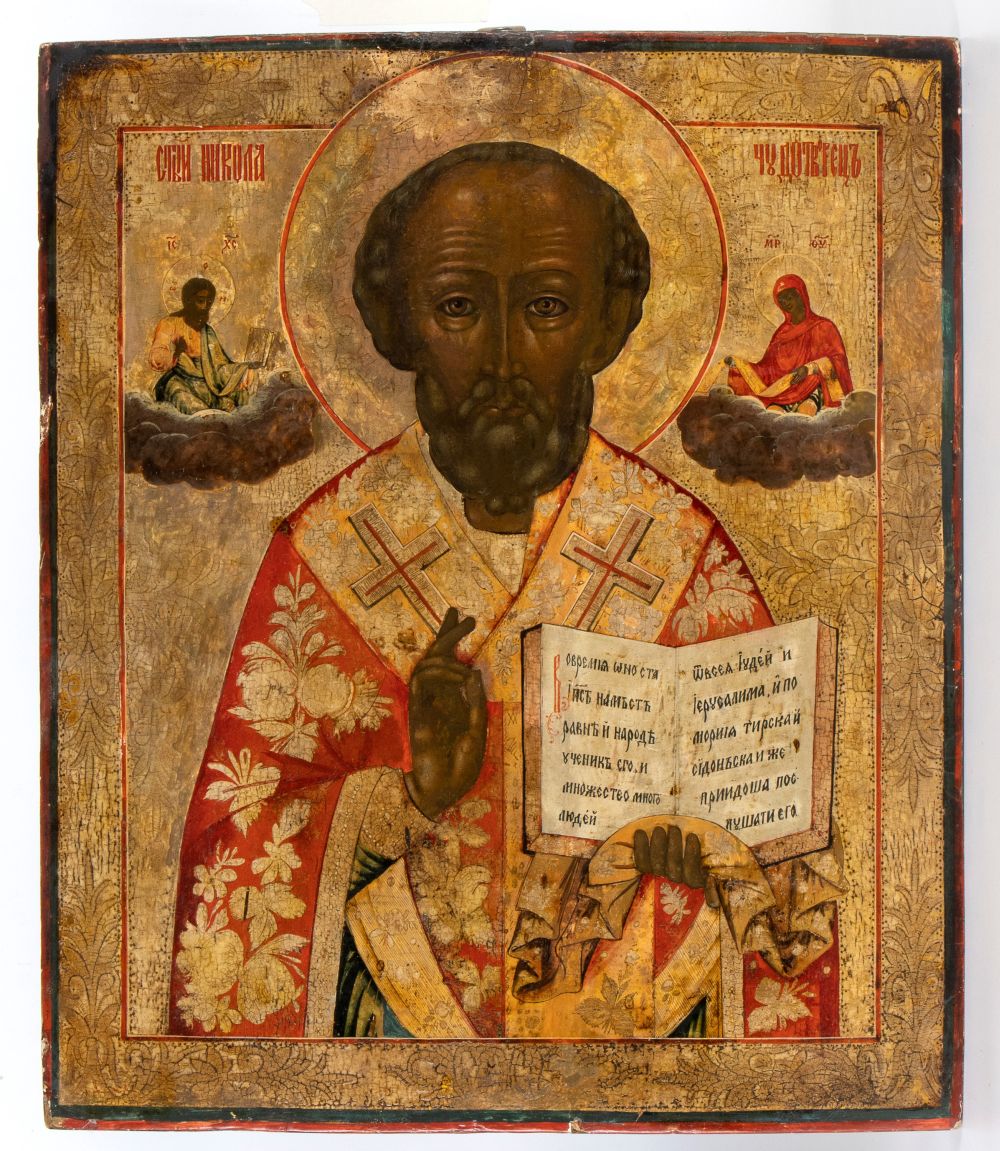 Icona russa raffigurante San Nicola taumaturgo affiancato da Gesù e la Vergine XIX secolo Altezza x larghezza x profondità: 54 x 45 x 3 cm.