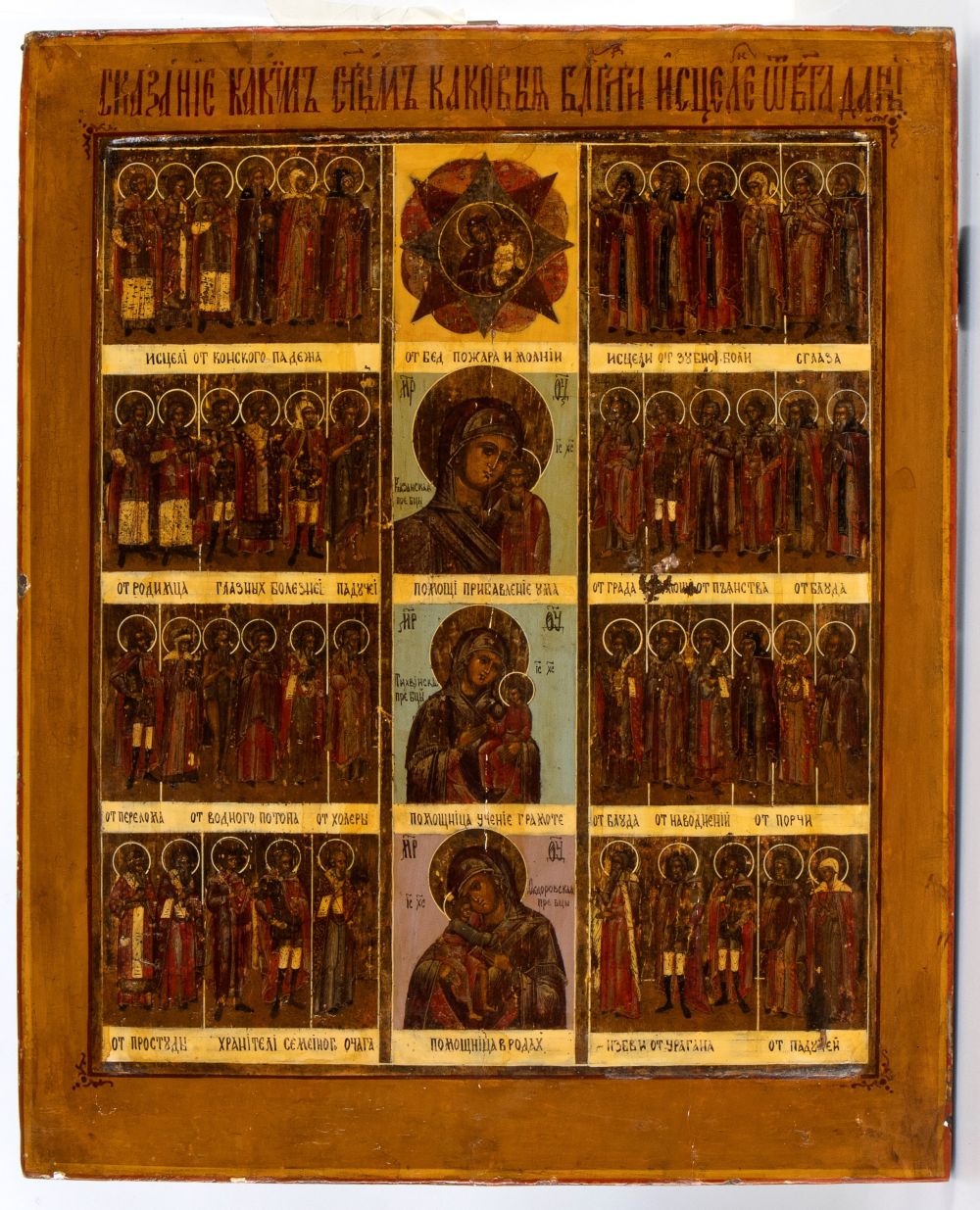 Icona russa raffigurante iconografie della Vergine e santi XIX secolo