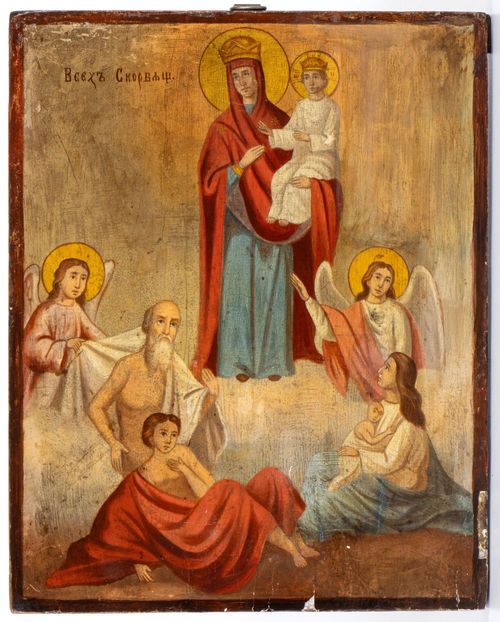 La Madre di Dio è raffigurata al centro a figura intera insieme al bambino; le figure che circondano la Vergine sono malati, affamati, minorati, sofferenti d’ogni categoria, e sono aiutati da Angeli, quali messaggeri della sua materna benevolenza.