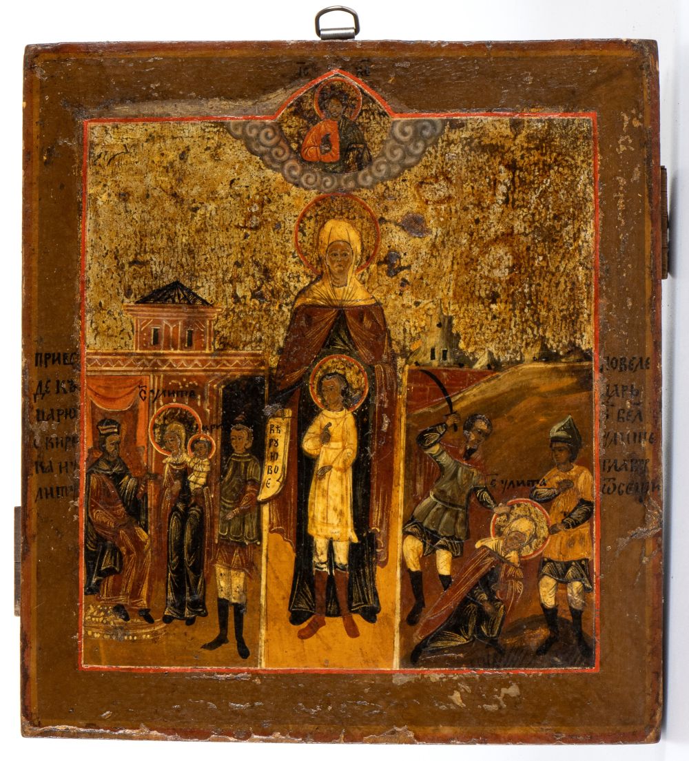 Icona russa raffigurante Santa Ulita e suo figlio XIX secolo Altezza x larghezza x profondità: 29 x 26,5 x 2,8 cm.