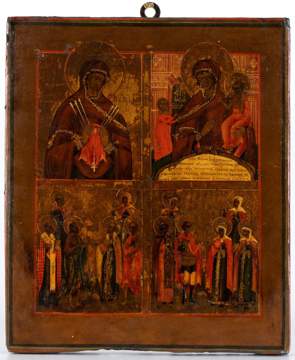 Icona quadripartita raffigurante: ''Madonna dei sette dolori'', ''Madre di Dio Gioia inaspettata'', Gesù con i Santi e la Madonna con i Santi.