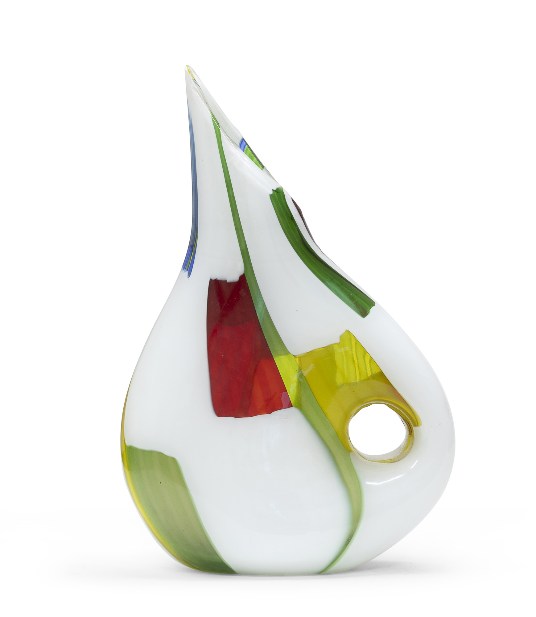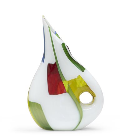 a fondo lattimo bianco con inserti in vetro trasparente verde, giallo e rosso.