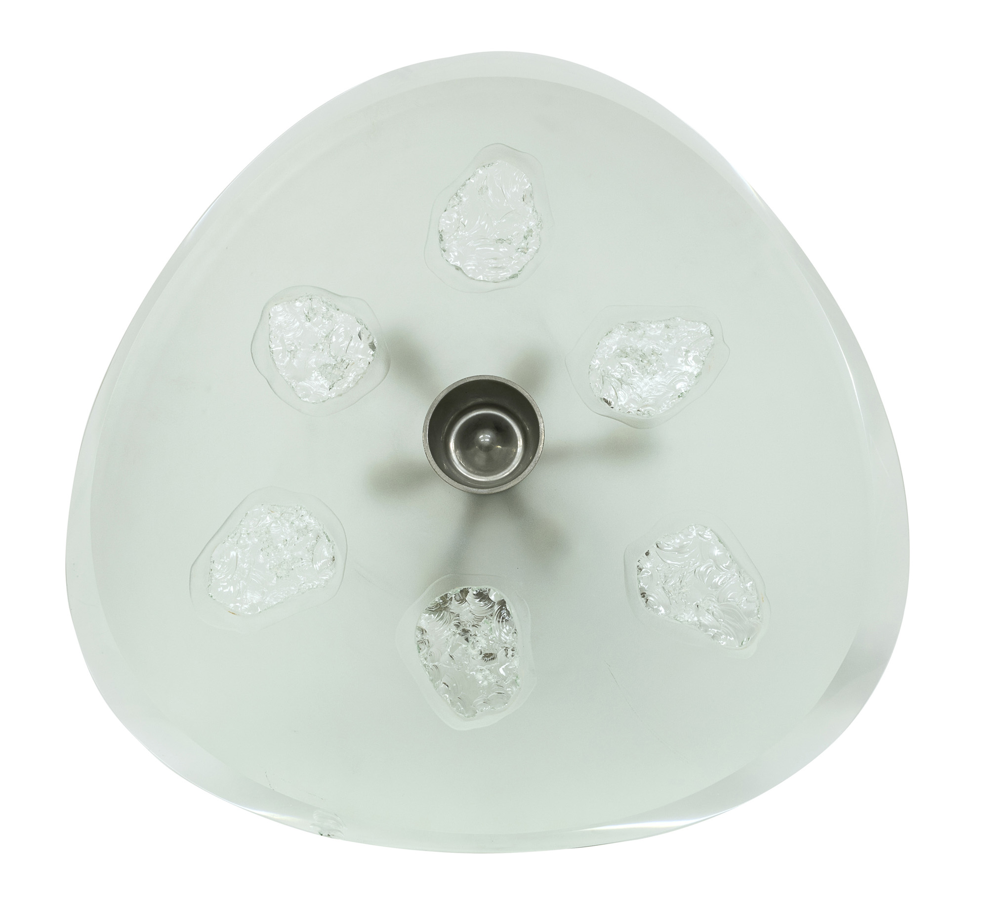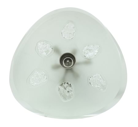 Con diffusore in cristallo molato trasparente e sabbiato centralmente. Inclusioni in vetro spaccato e struttura in ottone.