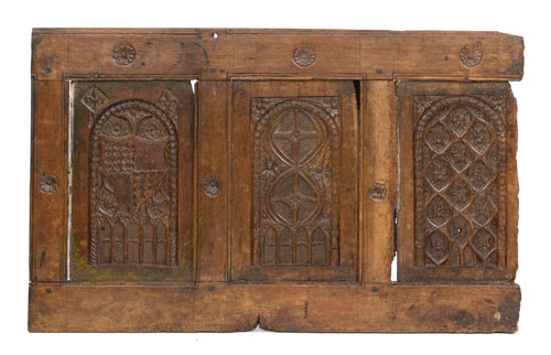PANNELLO GOTICO IN LEGNO SCOLPITO, XIV SECOLO, tripartito a formelle con intagli a motivi gotici diversi; mancanze.