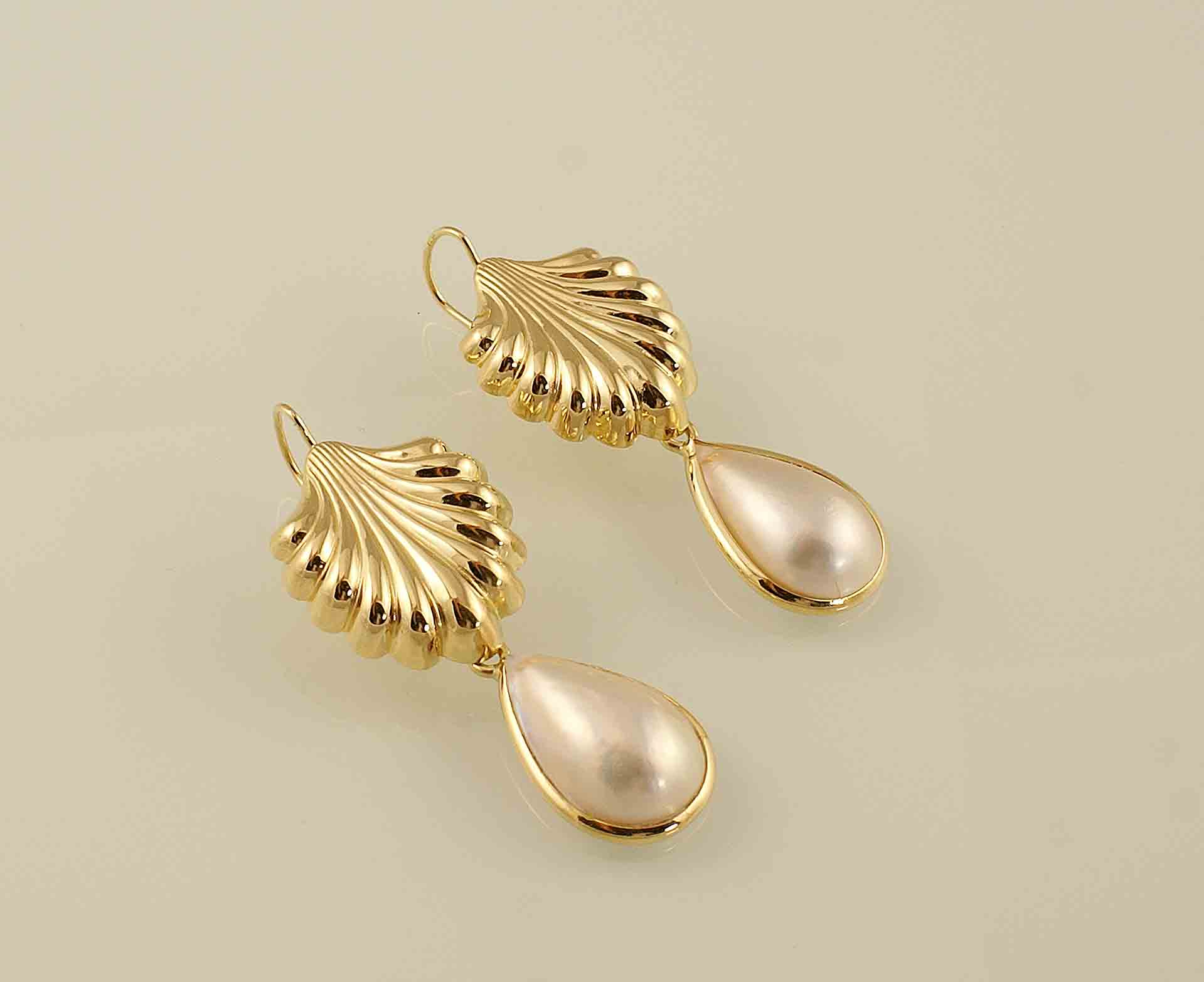 Orecchini pendenti in oro giallo 18kt con incastonate due perle mabè a goccia, gr. 8.