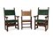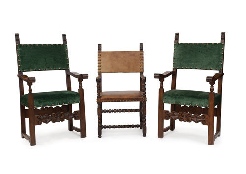 COPPIA DI POLTRONE IN NOCE, XVIII SECOLO, braccioli curvi e sostegni con cartelle intagliate, unite a POLTRONA IN NOCE, XVIII SECOLO, traverse a rocchetto e seduta e schienali in pelle; restauri, sostituzioni e usure.
