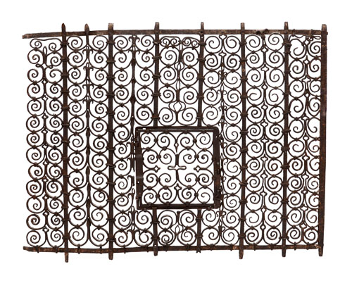 GRATA IN FERRO FORGIATO, XVI SECOLO, centrata da sportello incernierato con decori a spirali contrapposte su file parallele; difetti e usure.