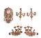 UN'APPLIQUE IN LEGNO SCOLPITO E DORATO A MECCA, XVIII SECOLO, centrato da stemma Savoia con teste di putto; usure; unita a DUE COPPIE DI APPLIQUES IN METALLO IN STILE ANTICO, XX SECOLO, a tre fiamme cadauna.